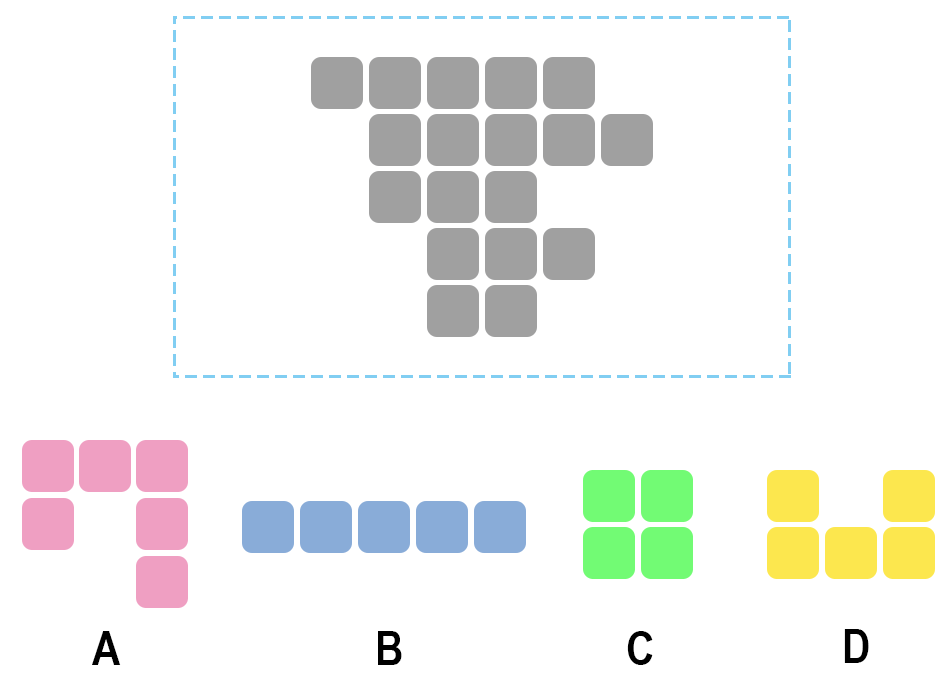 第8問 A B C D4つのブロック図が下にあります。この4つのブロックを用い灰色のブロック図を組み立てます。しかしA B C Dのブロックに一つだけ間違いがあり組み立てることができません。間違った形をしたブロックは以下の選択肢のうちどれですか?(各ブロック一度しか使えません)